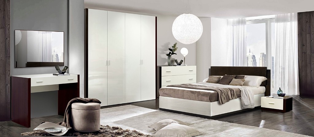 Современный и изысканный дизайн спальни «Арго» определяется ее цветовой гаммой и оформлением фасадов всех составляющих: кровать, шкаф, тумбы. Вместе с ЛДСП здесь использована ткань с интересной текстурой, которая придает элементам оригинальный дизайн. Двуспальная кровать с высоким прямоугольным изголовьем имеет размер спального места 1600х2000 мм. Прикроватные тумбы – практичный вариант для хранения мелочей. Функциональная конструкция и у шкафа распашного типа. В спальне ему также отводится важное место. В одной части можно хранить одежду на вешалках, в другом – на полках.