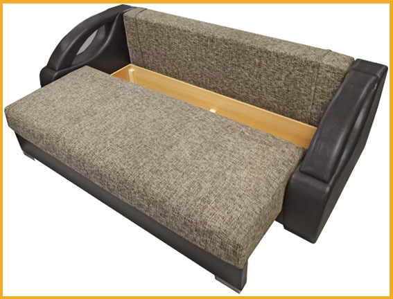Современный стильный дизайн. Мягкие дугообразные подлокотники. Возможность использования как центральный обьект интерьера. При трансформации требуется расстояние между стеной и диваном. Ровное спальное место. Для удобства присутствует задняя стенка в режиме спального места. Наличие ящика для хранения спальных принадлежностей. В основании спинки и сиденья деревянная рамка, на которую кладется блок независимых пружин с настилом из эластичного пенополиуретана. Диван комплектуется съемными приспинными подушками, выполненными из формованного ППУ. Механизм раскладки- пантограф(тик-так)