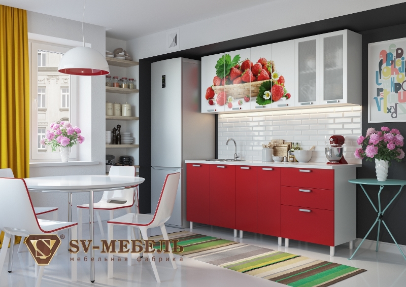 - Кухонный гарнитур «Фрукты» с фотопечатью комплектуется цельной столешницей «Антарес».