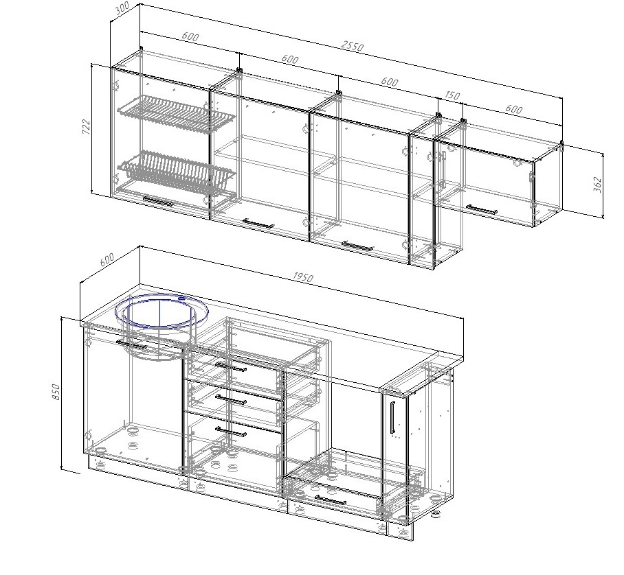 - Фасады со свесом – дают возможность использовать верхние модули без установки ручек, а также установить скрытую подсветку