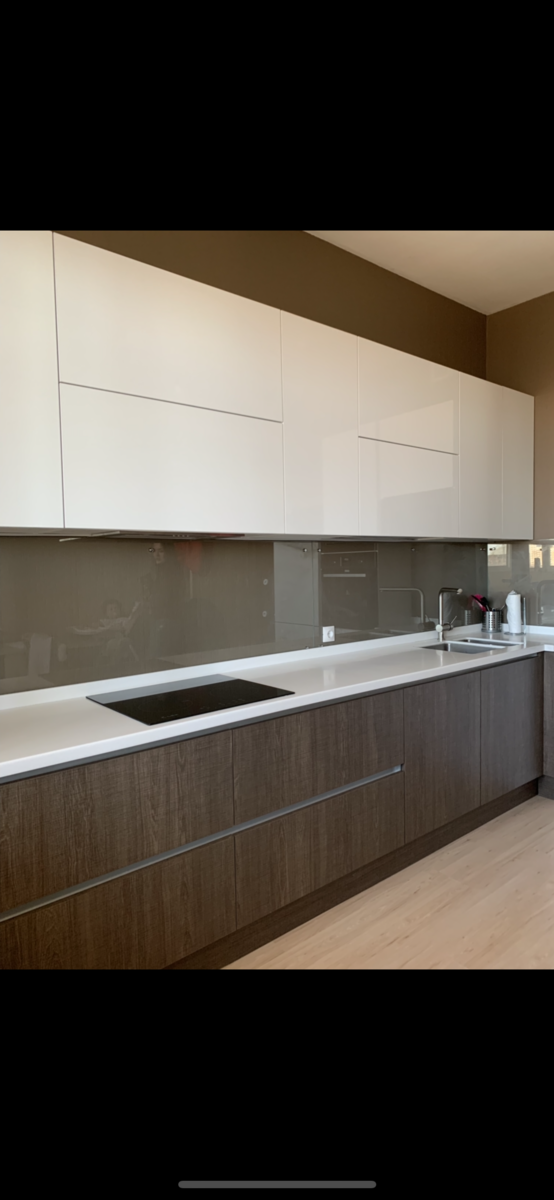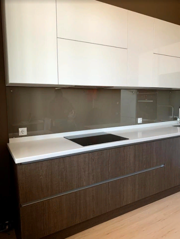 К кухне можно заказать фартук (мебельный щит) ХДФ с фотопечатью, стекло с фотопечатью либо фартук в цвет столешницы.