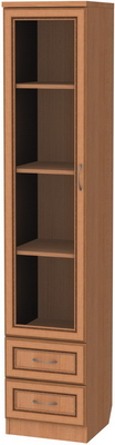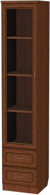 Эта модель шкафа подойдет для сочетания с другой мебелью из того же набора. Его высота и то, что в нем присутствуют ящики, визуально разбавляет сплошные витрины на остальных элементах и по-своему делает комплект разнообразным.