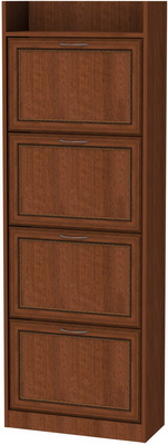 Данная модель оборудована четырьмя вместительными отделениями, куда может вместиться пару десятков комплектов обуви всей семьи. Она без проблем справится с задачей хранения и содержания в порядке и зимних, и летних пар, и даже более того – не займет много места в прихожей. Ведь даже большие прихожие нуждаются в рациональном размещении мебели. Эта высокая и неширокая тумба – именно то, что нужно. Каждое из отделений разделено на две секции, если Вы посмотрите на модель в раскрытом виде, то поймете, насколько она функциональна! Очень жаль, что зачастую этому важному элементу интерьера не придается необходимого значения. Установив дома такую тумбы, Вы обязательно оцените ее удобство. Но не только это отличает предлагаемую модель. Она станет еще и несомненным украшением Вашей прихожей. Поскольку внешнее оформление предполагает один из пяти возможных вариантов имитации ценных пород дерева, эта тумба обязательно привлечет к себе внимание Ваших гостей – она смотрится дорого и солидно. Оформлено изделие в классическом стиле, универсальном и подходящем к большинству вероятных дизайнерских решений в стилевом наполнении интерьера прихожей. Светлая и просторная прихожая предполагает светлую мебель – в таком случае молочный дуб – то, что Вам нужно. Темный благородный оттенок ясеня Шимо придаст элегантности и благородства. А в современный стиль, конечно, замечательно впишется оттенок венге.
