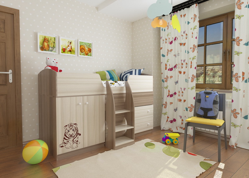 Комплекс сочетает в себе функции 3 в 1: есть место для хранения вещей с комодом и шкафом, место для учебы и творчества, и комфортное место для сна. Рабочий стол с выдвижными ящиками при необходимости компактно задвигается под спальное место, что экономит пространство в комнате. Спокойная цветовая гамма комплекса подойдет к любому интерьеру, а принт с веселым тигренком напомнит детям о бережном отношении к природе.