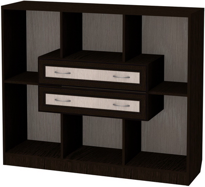 В центре композиции расположены два выдвижных ящика, глубина которых, как и самого стеллажа, составляет 37 см. Ящички оборудованы двумя ручками, при помощи которых его можно легко и быстро открыть и закрыть. Легкость скольжения роликов по направляющим, размещенным на внутренних стенках, гарантирует длительную эксплуатацию изделия без поломок. Здесь вы сможете хранить различные мелкие предметы, канцелярские принадлежности и т.п.